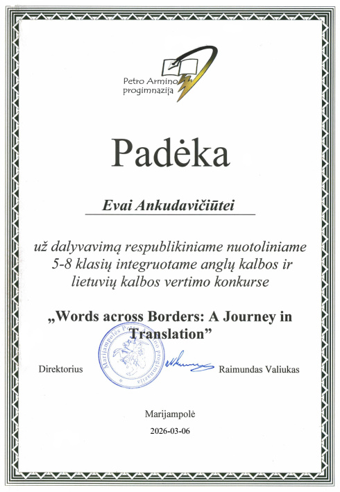 2026 m. nuo sausio 5 d. iki vasario 6 d. vyko respublikinis nuotolinis 5-8 klasių mokinių integruotas anglų kalbos ir lietuvių kalbos vertimo konkursas „Žodžiai be sienų: vertimo kelionė“ ("Words across Borders: a Journey in Translation"), kuriame mūsų mokyklai atstovavo 8 klasės mokiniai Eva Ankudavičiūtė ir Simas Davicijonas.